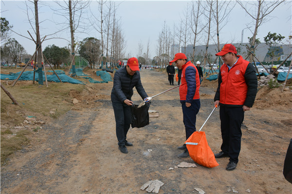 上午十时三十分,志愿服务活动开始后,米兰官方网站-米兰MiLan(中国) 党委委员、副总经理、项目部总经理汪洋亲自带头参加活动,其他党员干部带头干,职工群众积极干,参建单位负责人志愿加入干,大家拿起工具、弯下腰去,捡起草地上的生活垃圾,集中放进现场放置的垃圾桶内;没有拿到工具的同志们也拿起简易垃圾袋,将捡到的生活垃圾放进垃圾袋盛满后再放进垃圾桶内。一时间,党徽熠熠、爱心闪闪、干劲满满,不到一个小时时间,约20人的志愿服务队伍完成了近20000平米区域的垃圾清理任务,景观施工现场面貌大为改观。